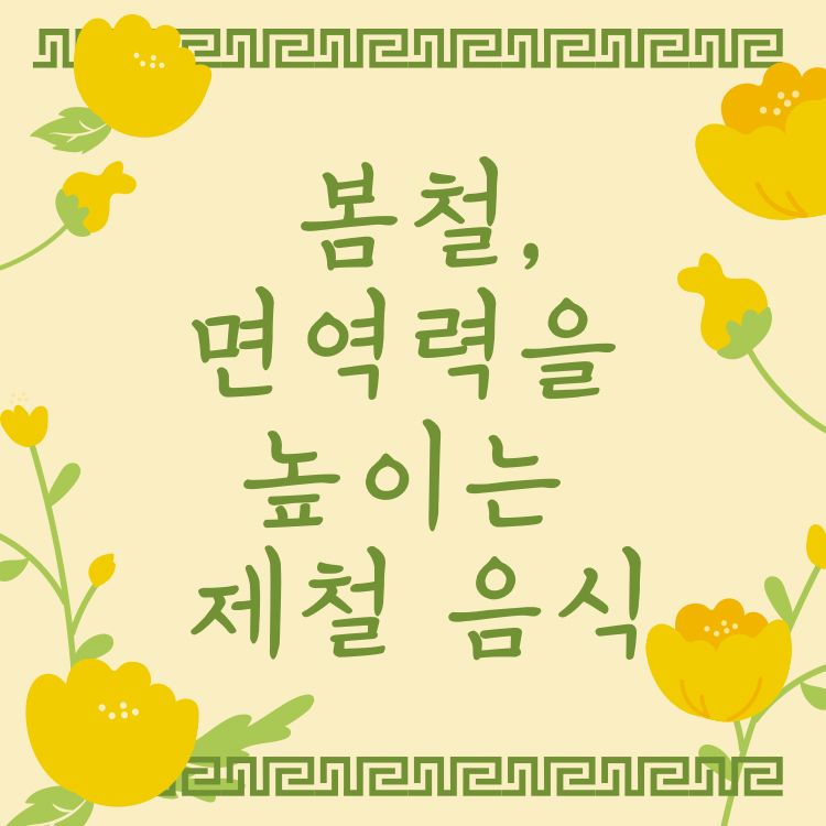 우리 몸은 외부의 병균, 바이러스로부터 자신을 스스로 보호하는 강한 방어 체계를 가지고 있습니다. 이러한 시스템을 면역이라고 하는데, 면역력은 그 힘을 말하는 것으로 면역력이 높을수록 병에 걸릴 위험이 낮아지게 됩니다. 균현잡힌 식습관은 튼튼한 기초 체력을 만들어주며 면역력을 길러줍니다. 또한 제철음식을 섭취함으로써 맛은 물론 면역력을 높이는데 도움이 될 수 있습니다. 봄철에 가장 영양가가 풍부하며 쉽게 먹을 수 있는 제철음식을 정리해보았습니다.