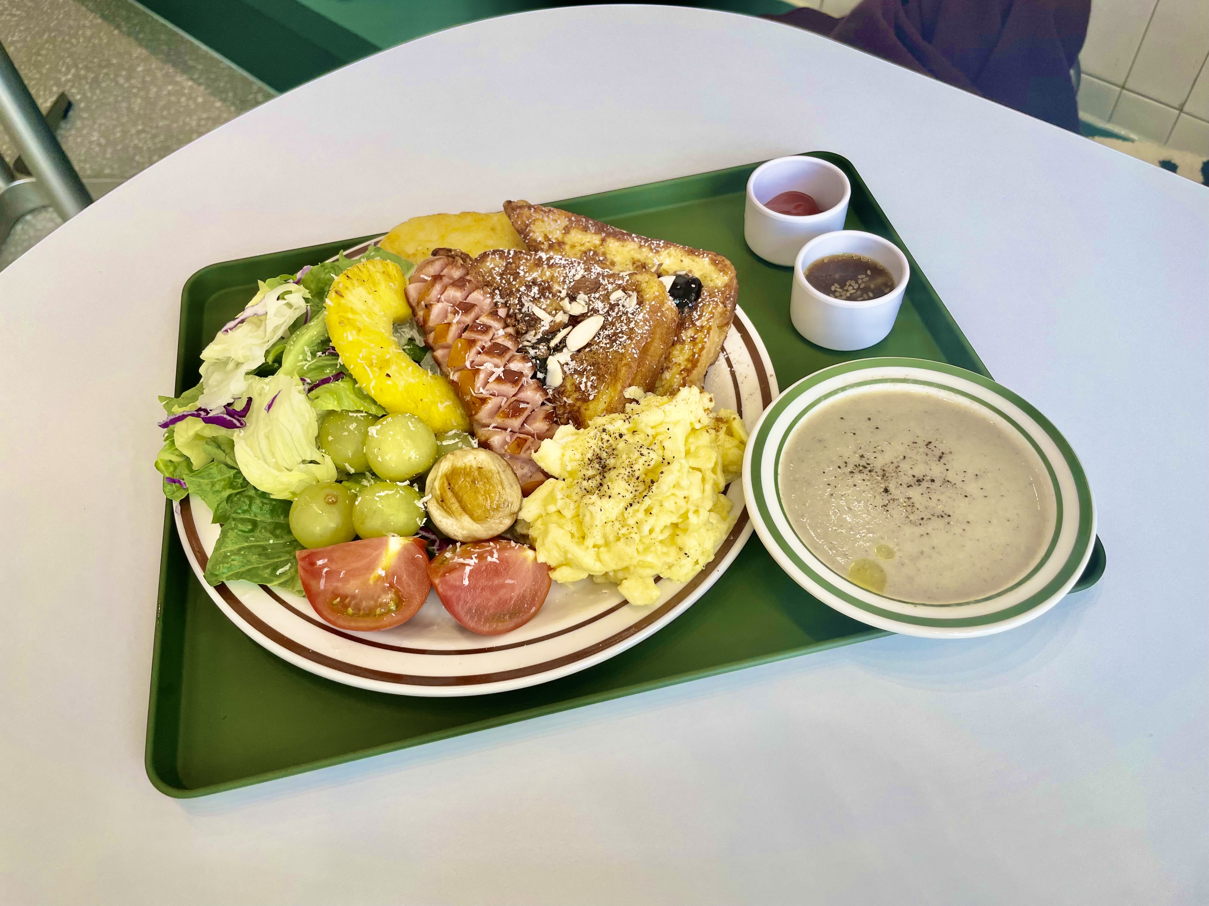 드디어 주문한 브런치가 나왔어요. 토스트랑 에그스크램블, 소시지, 해쉬브라운, 그리고 샐러드가 한 접시에 담겨있고, 트러플오일이 들어간 스프가 함께 나오네요.